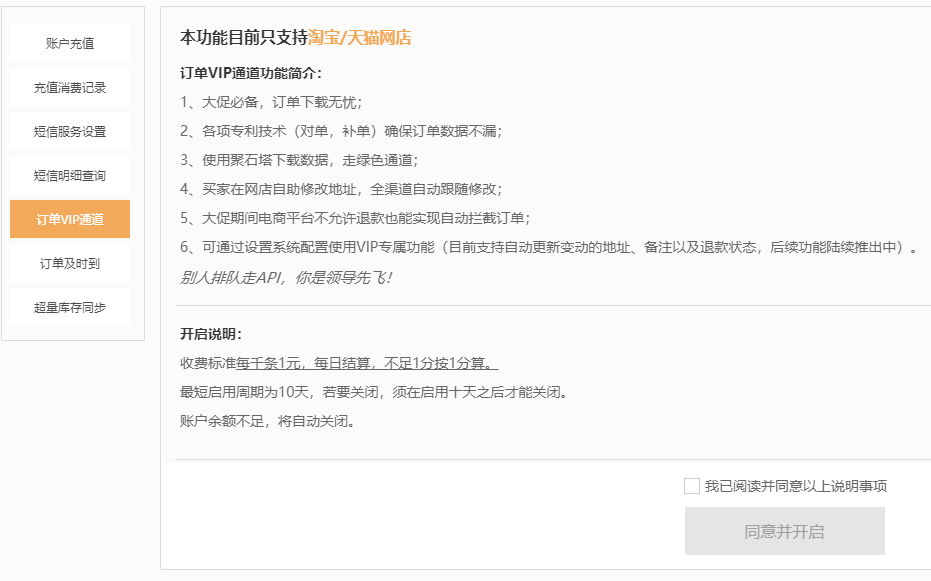 网店订单VIP服务 合包含两项核心权益:一是针对所有网店可开通短信服务,实现催付、已付款及发货的自动通知;二是针对淘宝 / 天猫网店可开通 VIP 绿色通道,支持大促订单秒下载、防漏单、买家地址自动同步、拦截退款订单等专属功能。