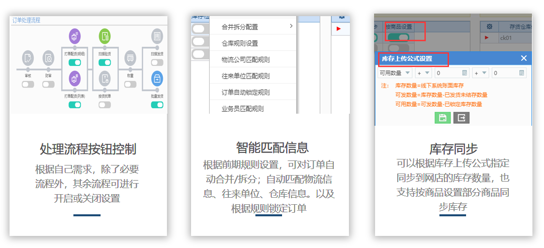 商品处理 包含两项核心能力:一是配置商品套餐,支持将网店商品打包售卖,全渠道可对应设置组合商品与网店套餐;二是设置赠品规则,提前配置好赠送商品后,订单下载时会智能匹配对应的赠品,助力提升商品组合销售与促销效率。
